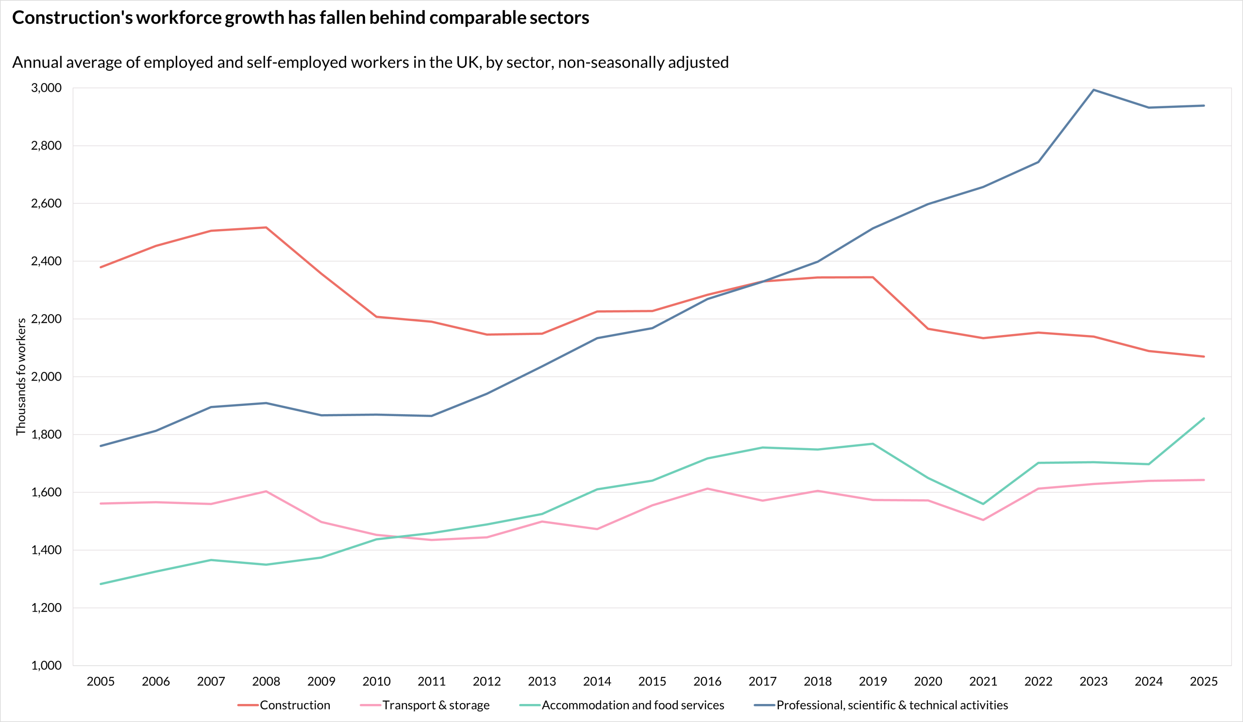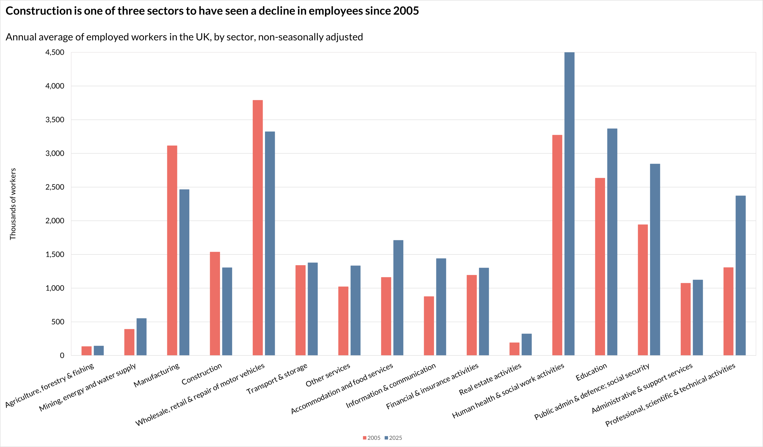 Unlike most other sectors, the size of construction’s employed workforce in 2025 was lower than every five-year benchmark since 2005, according to data from the Official for National Statistics’ Labour Force Survey(1).