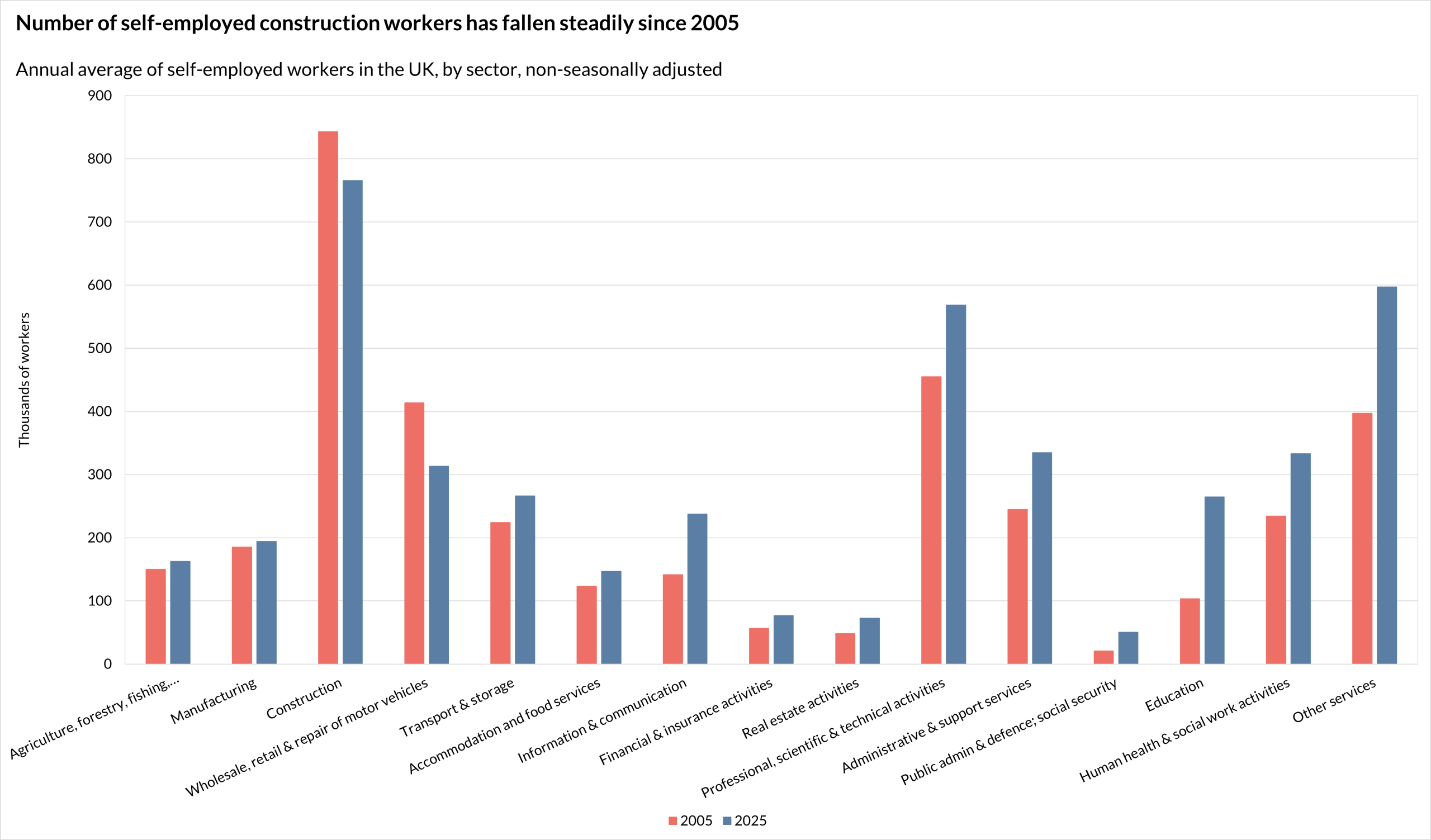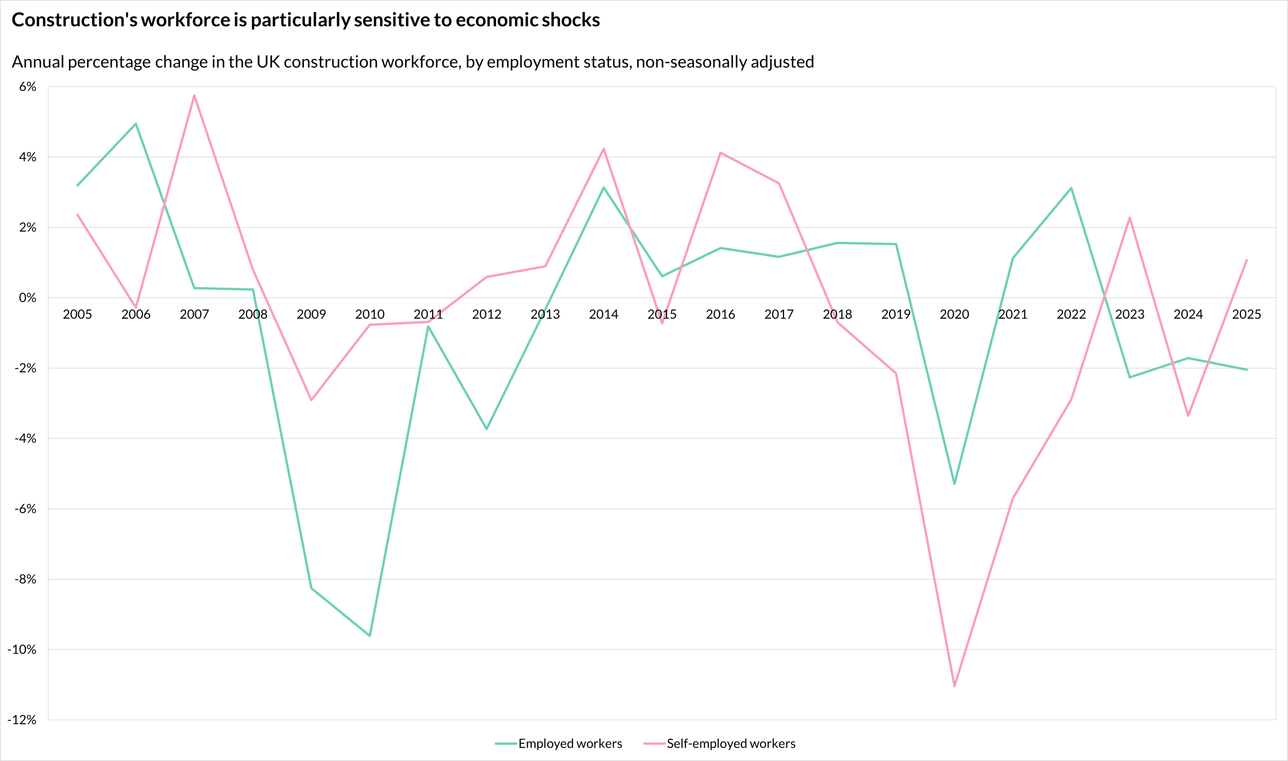 By contrast, self-employed construction workers showed a different pattern. Declines were less severe during the financial crisis (3% in 2009 and 1% in 2010), but more pronounced during the pandemic, with numbers falling by 11% in 2020 and 6% in 2021.