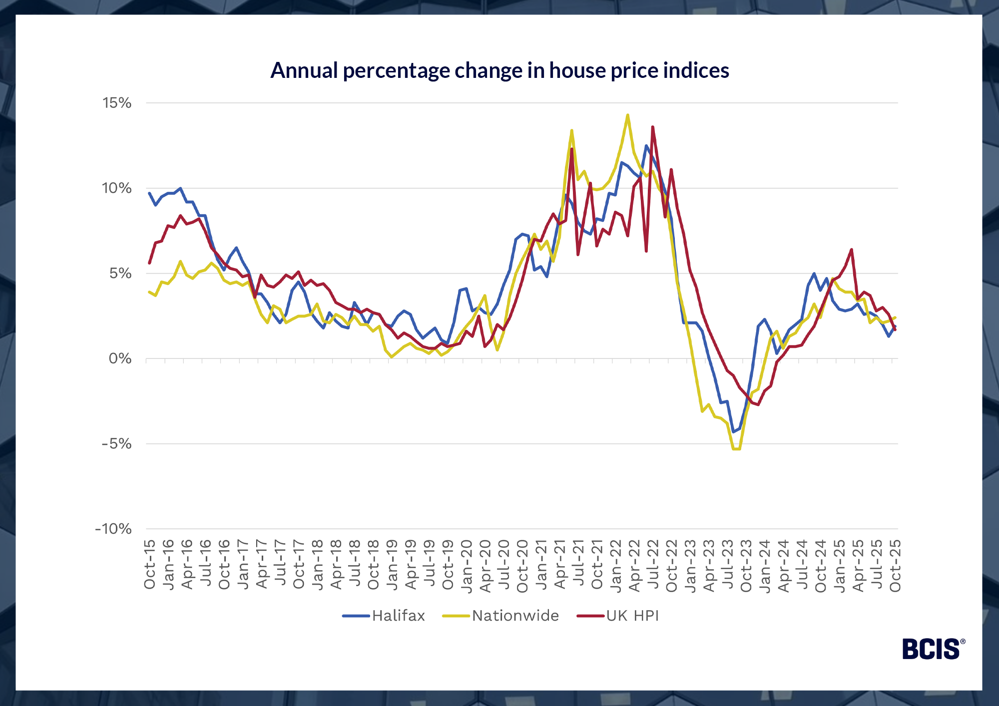 On a monthly basis, Halifax reported no price growth in November 2025 while Nationwide reported movement of 0.3%.