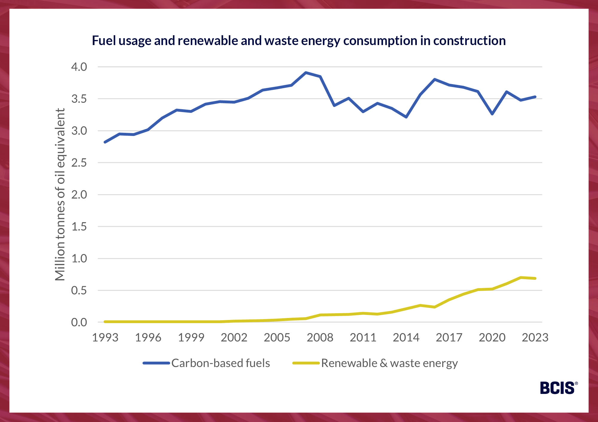 The latest figures show that in 2023, construction’s carbon-based fuel usage increased by 1.6% on the year and by just over one-quarter (25.1%) on 1993.