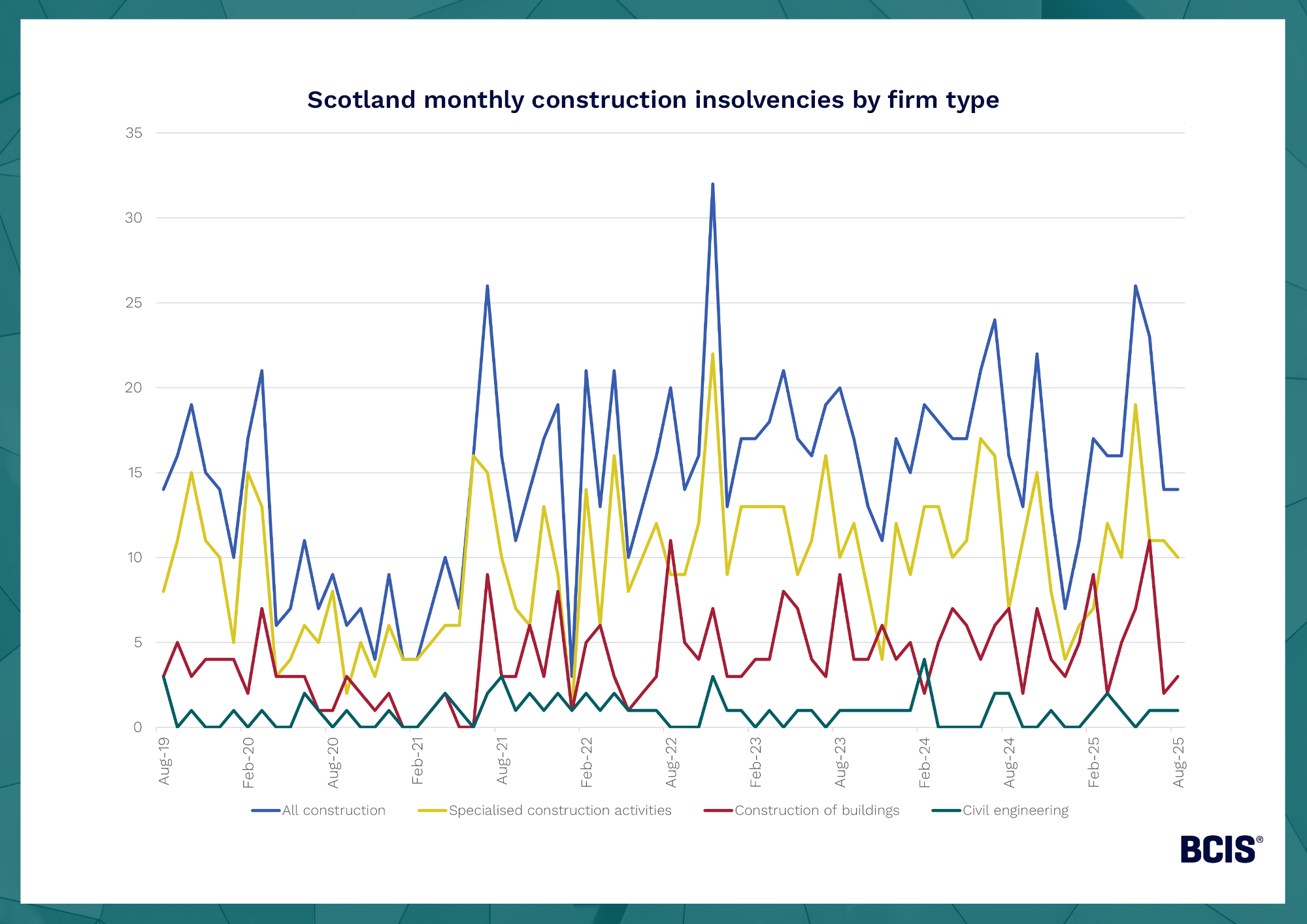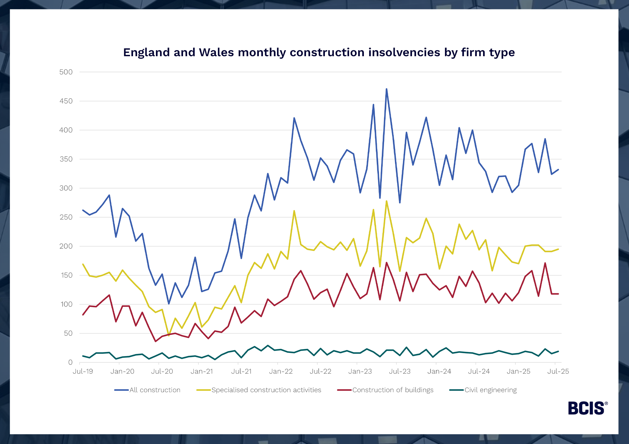 Further data(5) released by The Insolvency Service showed that 310, or 26%, of self-employed or trader bankruptcies in the 12 months to June 2025 were in construction in England and Wales.