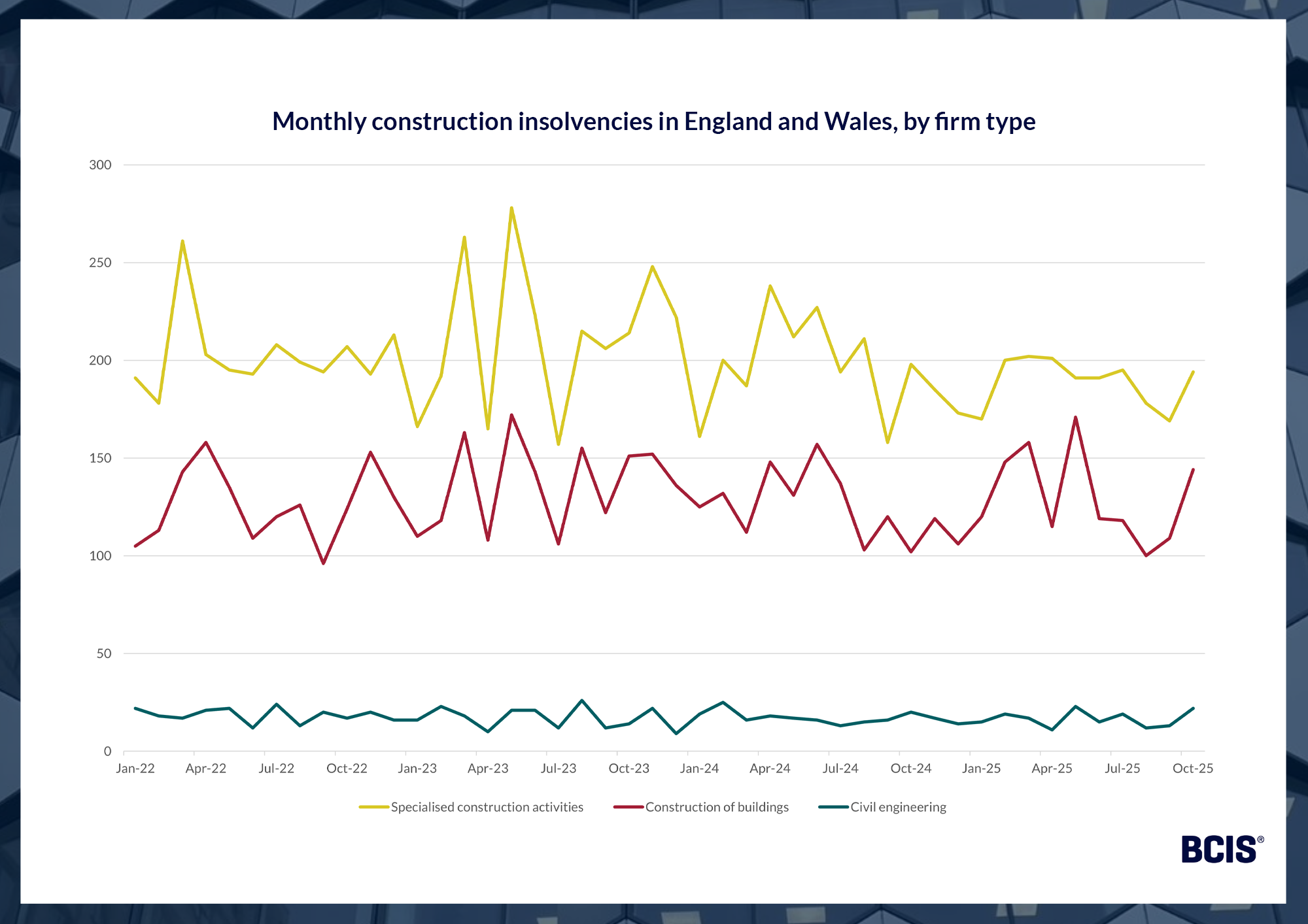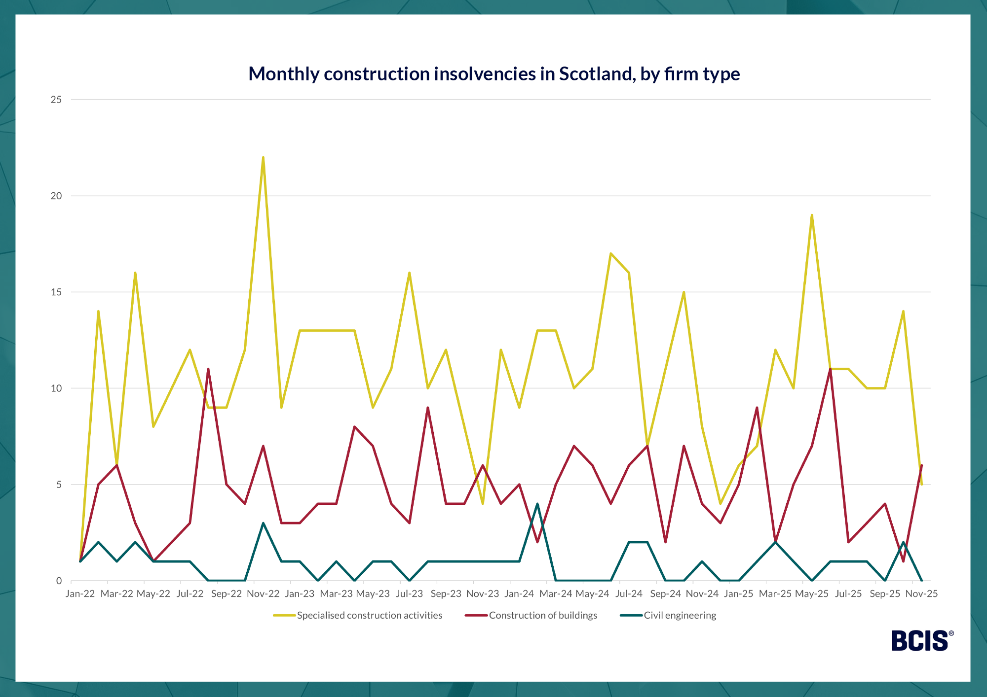 In Scotland, there were 11 construction company insolvencies in November 2025, six fewer than the 17 recorded in October 2025, and accounting for 11.2% of all insolvencies in the country.