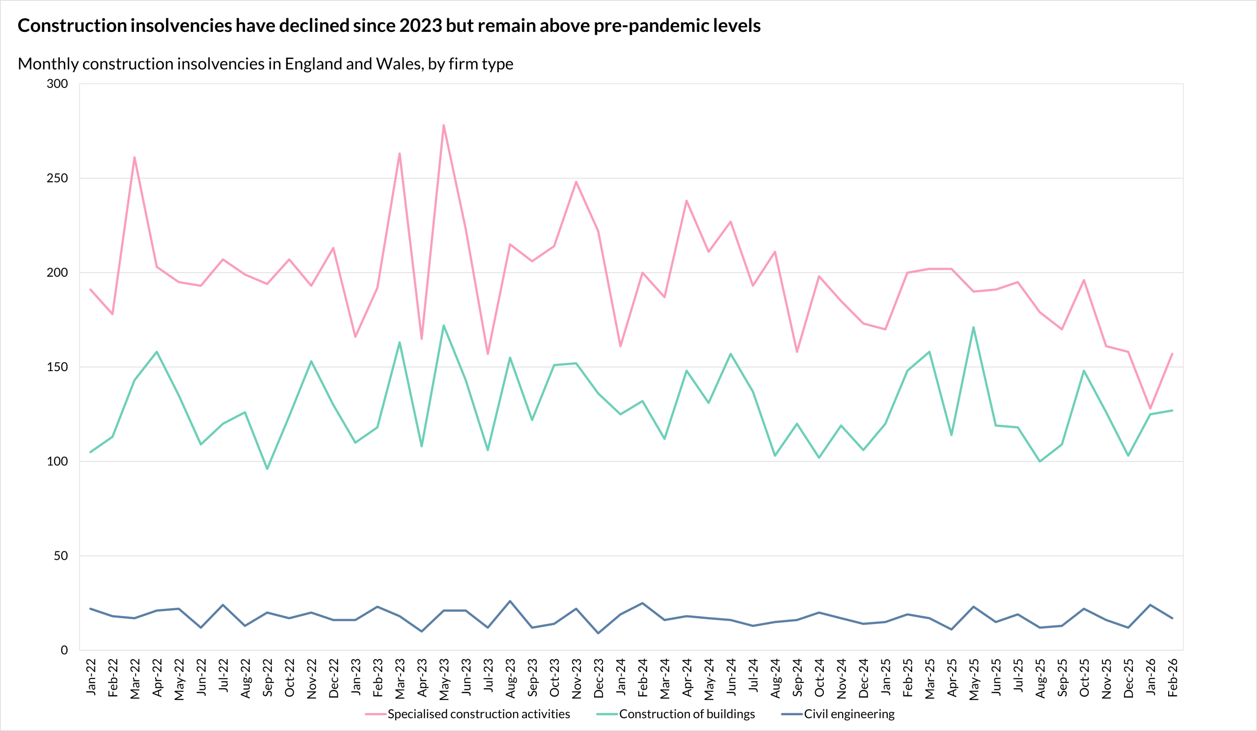 Further data(5) released by The Insolvency Service showed that 267, or 23%, of self-employed or trader bankruptcies in the 12 months to October 2025 were in construction in England and Wales.