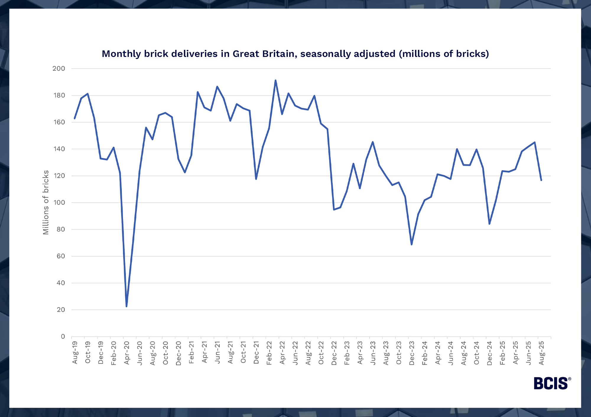 Dr David Crosthwaite, chief economist at BCIS, said: ‘Manufacturers of construction materials have to adjust their own output in line with demand, so there’s clearly an element of production responding to a cooler market. Brick deliveries, for example, remain well below pre-pandemic levels, while stocks are higher, suggesting that availability itself is not the primary issue.