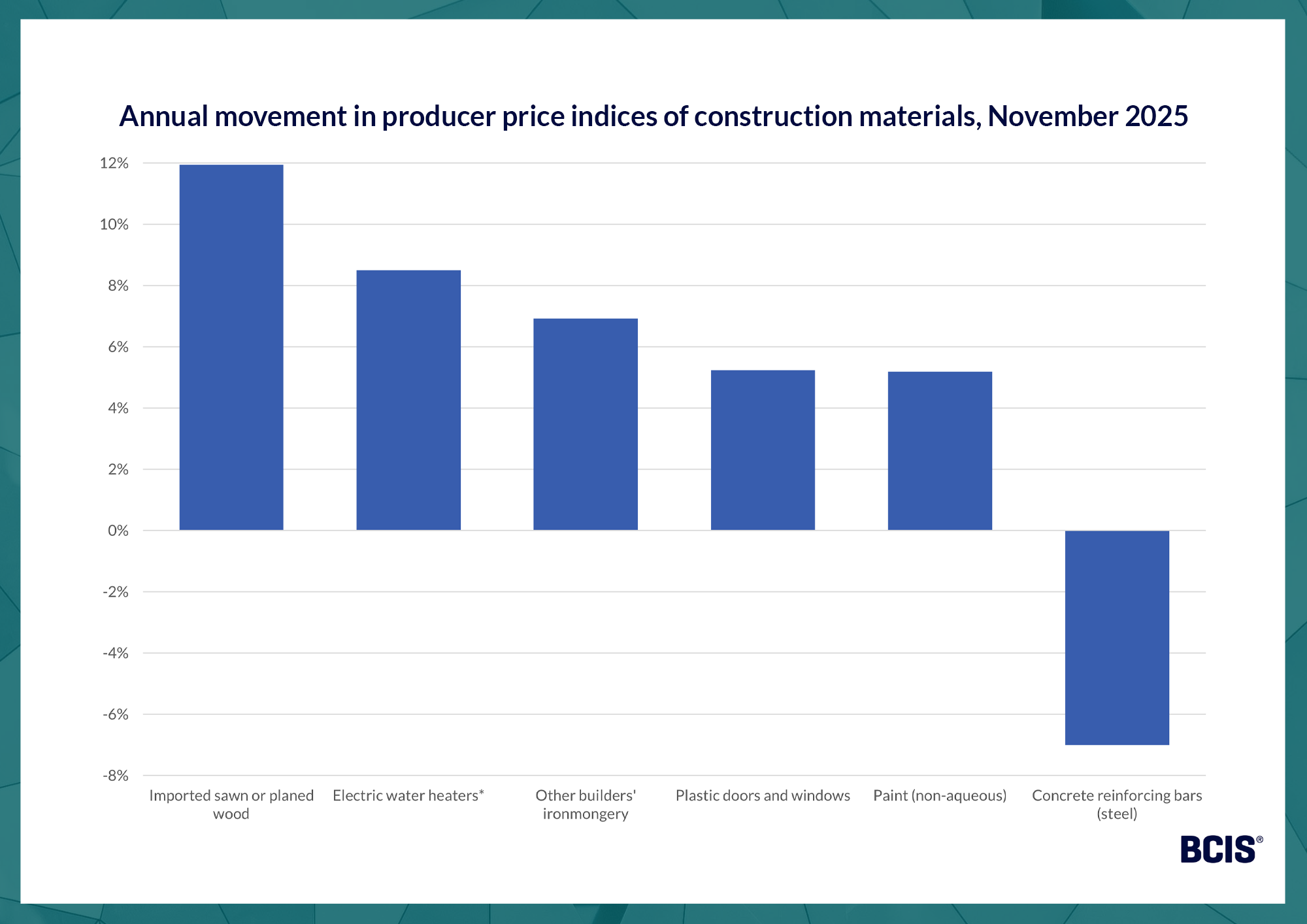 Elsewhere in the DBT report, the greatest annual inflation seen for individual resources was in imported sawn or planed wood prices, up 11.9% in the year to November 2025, followed by an 8.5% rise for electric water heaters.
