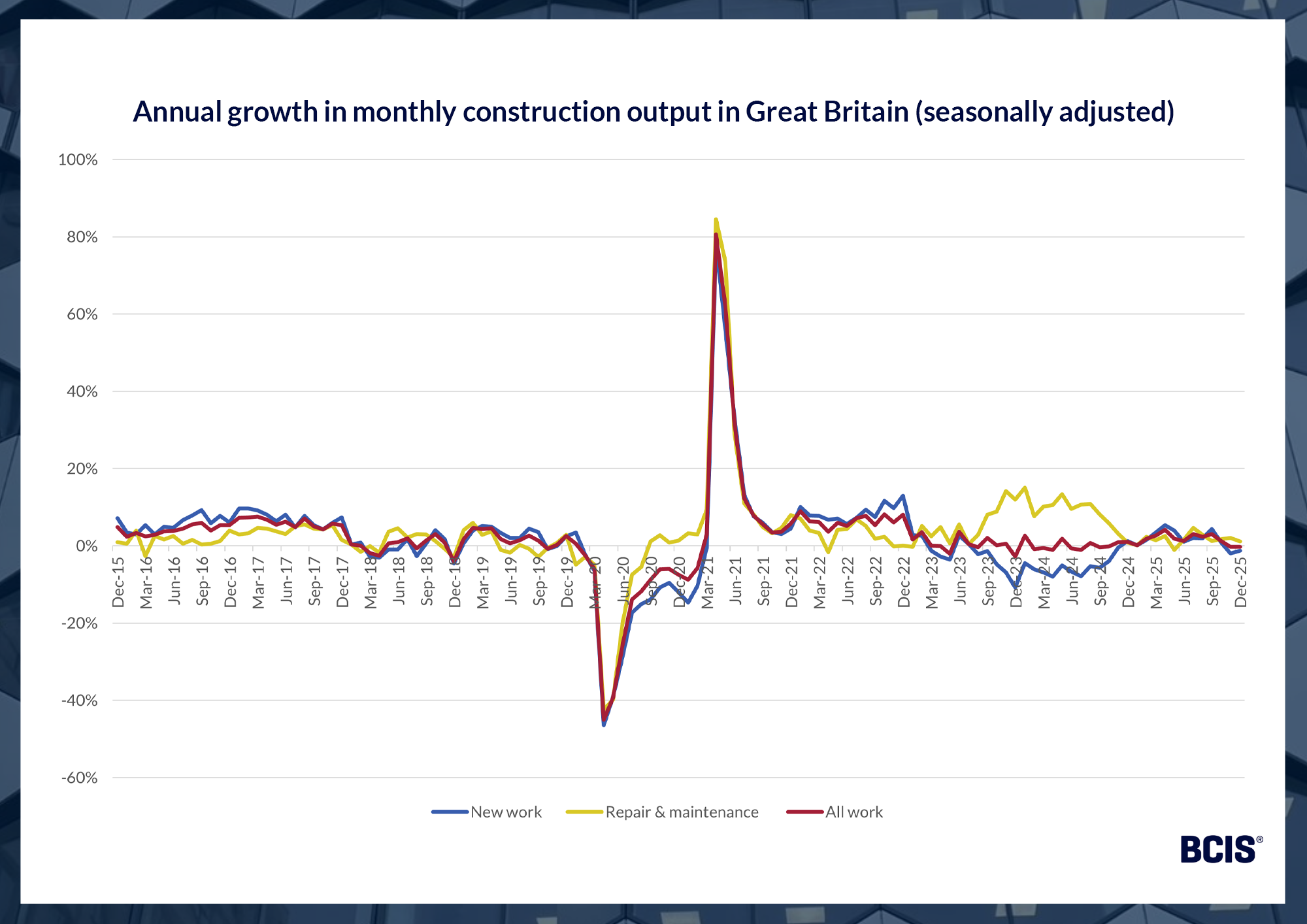 On an annual basis, total construction output fell by 0.3% in the 12 months ending in December 2025. New work decreased by 1.3% while R&M rose by 1.2%.