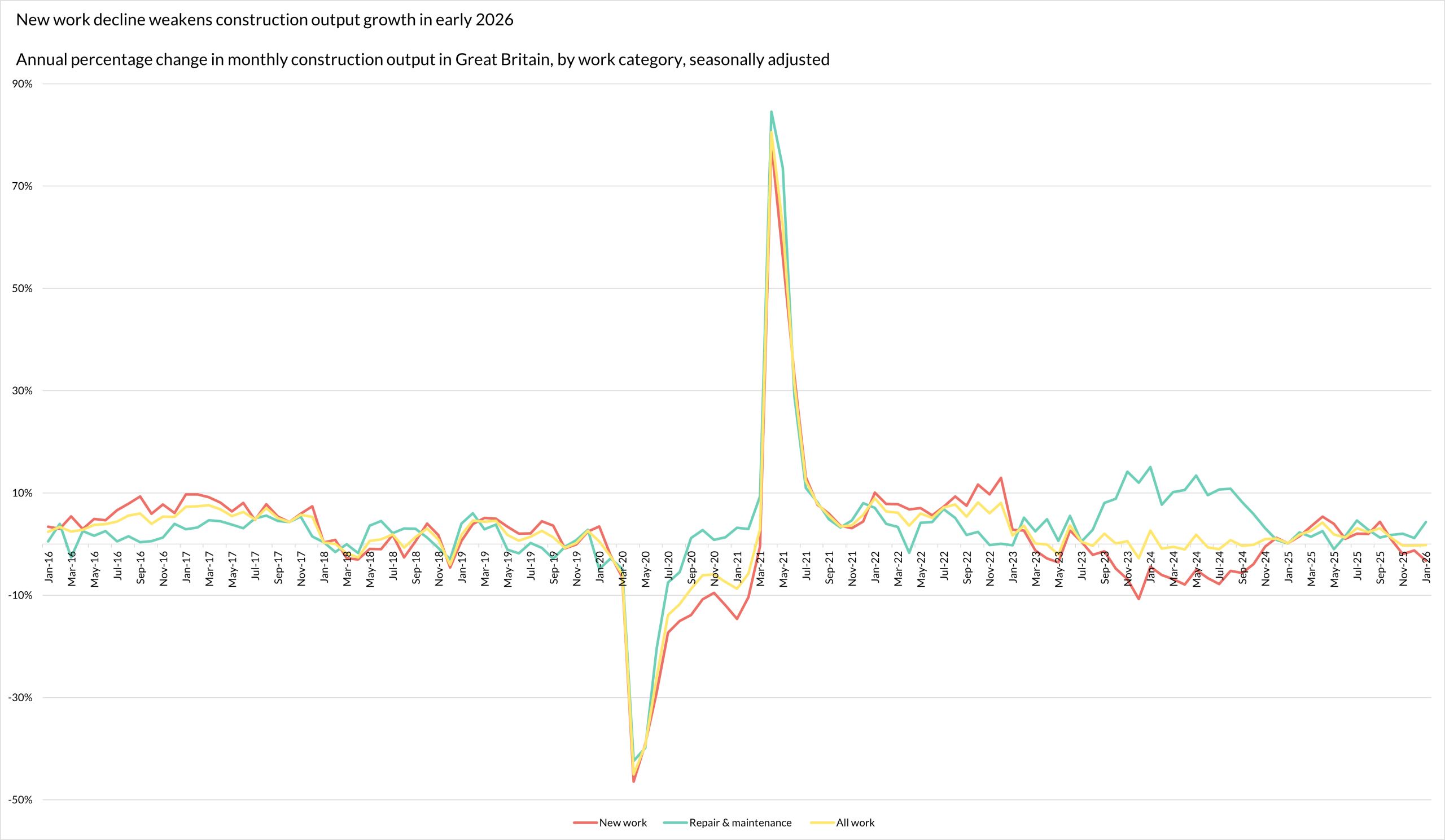 On an annual basis, total construction output fell by 0.2%. New work decreased by 3.3% in the 12 months ending in January 2026 while R&M rose by 4.3%.