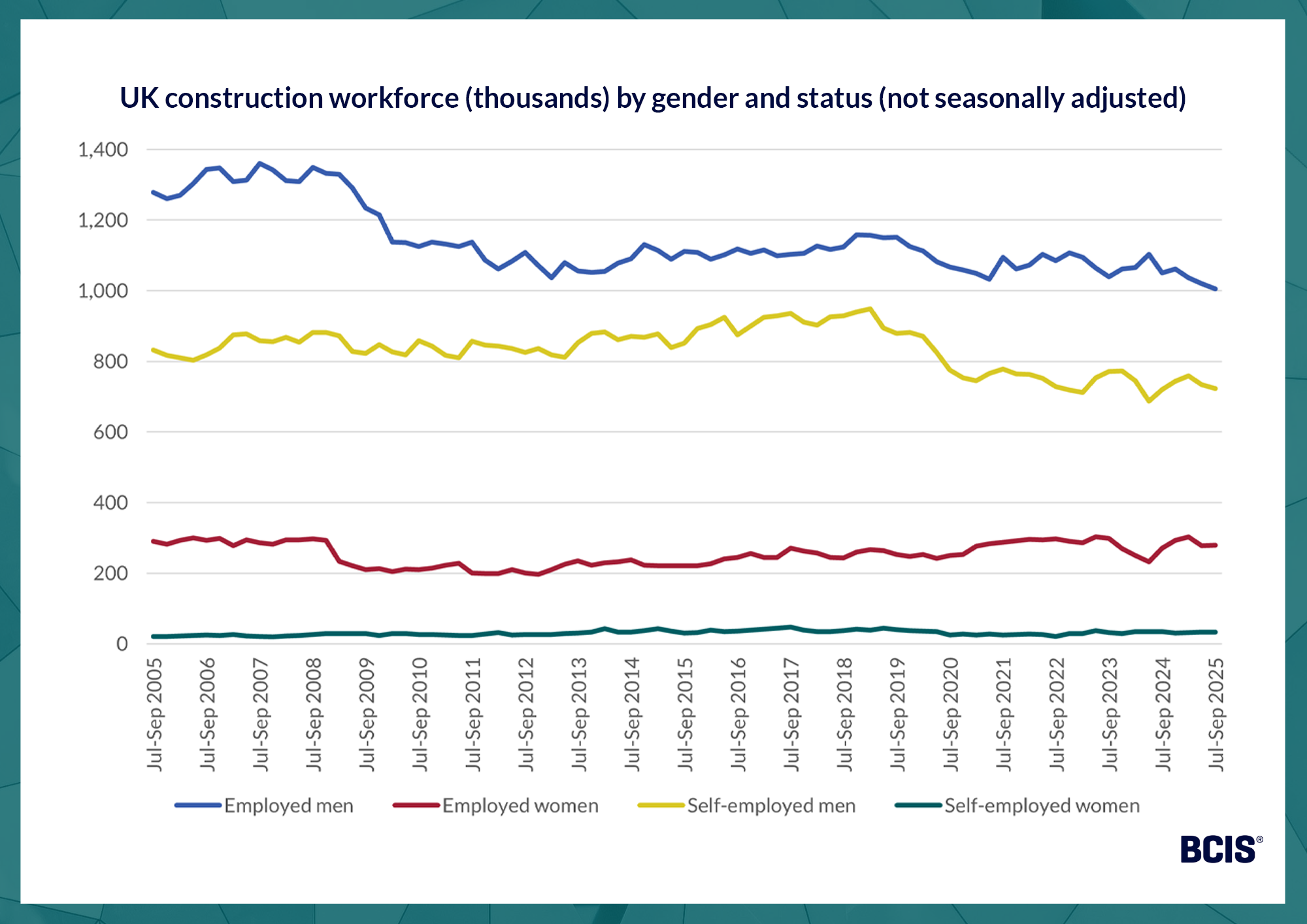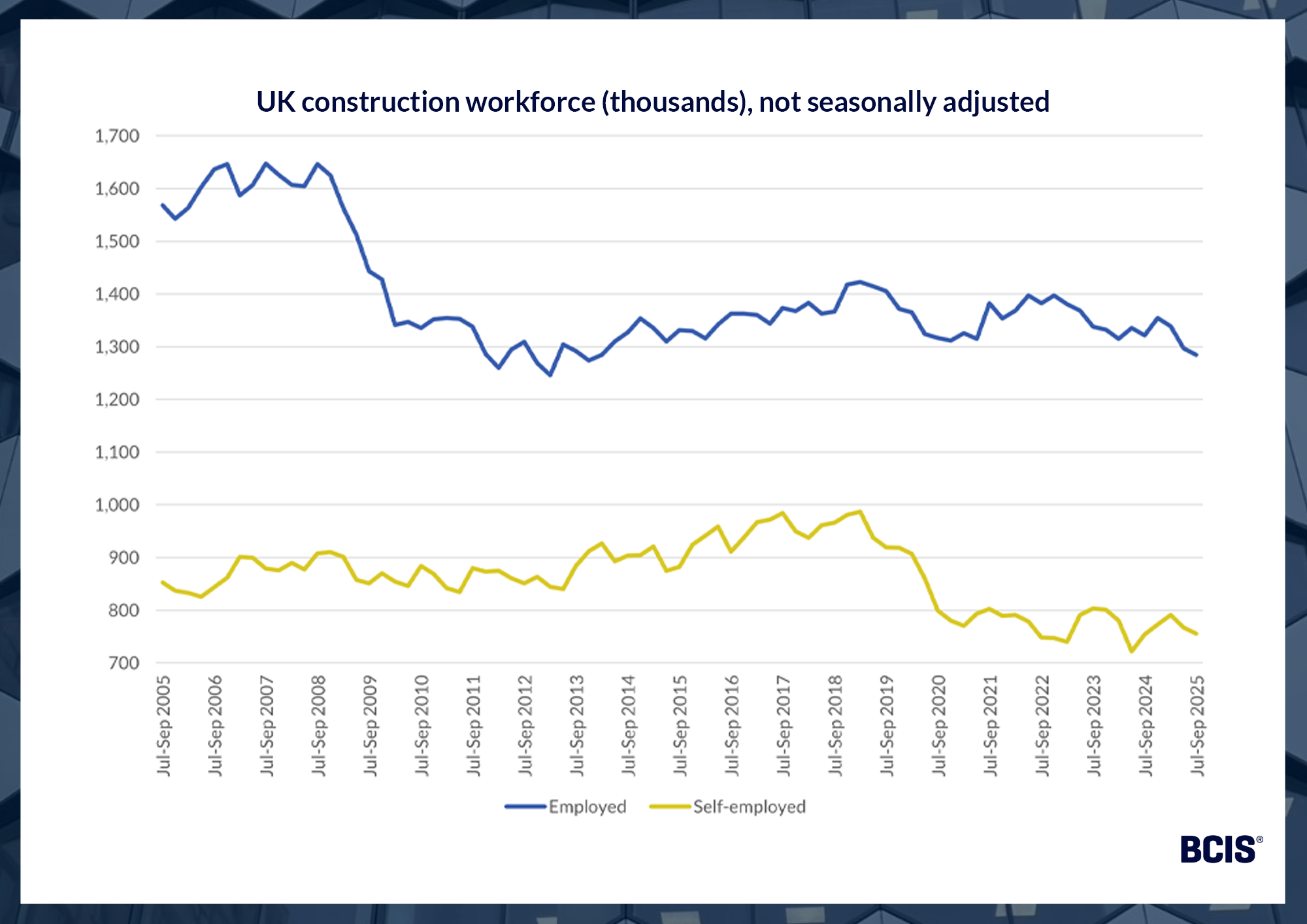 The UK construction workforce (not seasonally adjusted) shrank to its lowest level in almost 25 years in the third quarter of 2025, according to the latest employment data from the ONS.