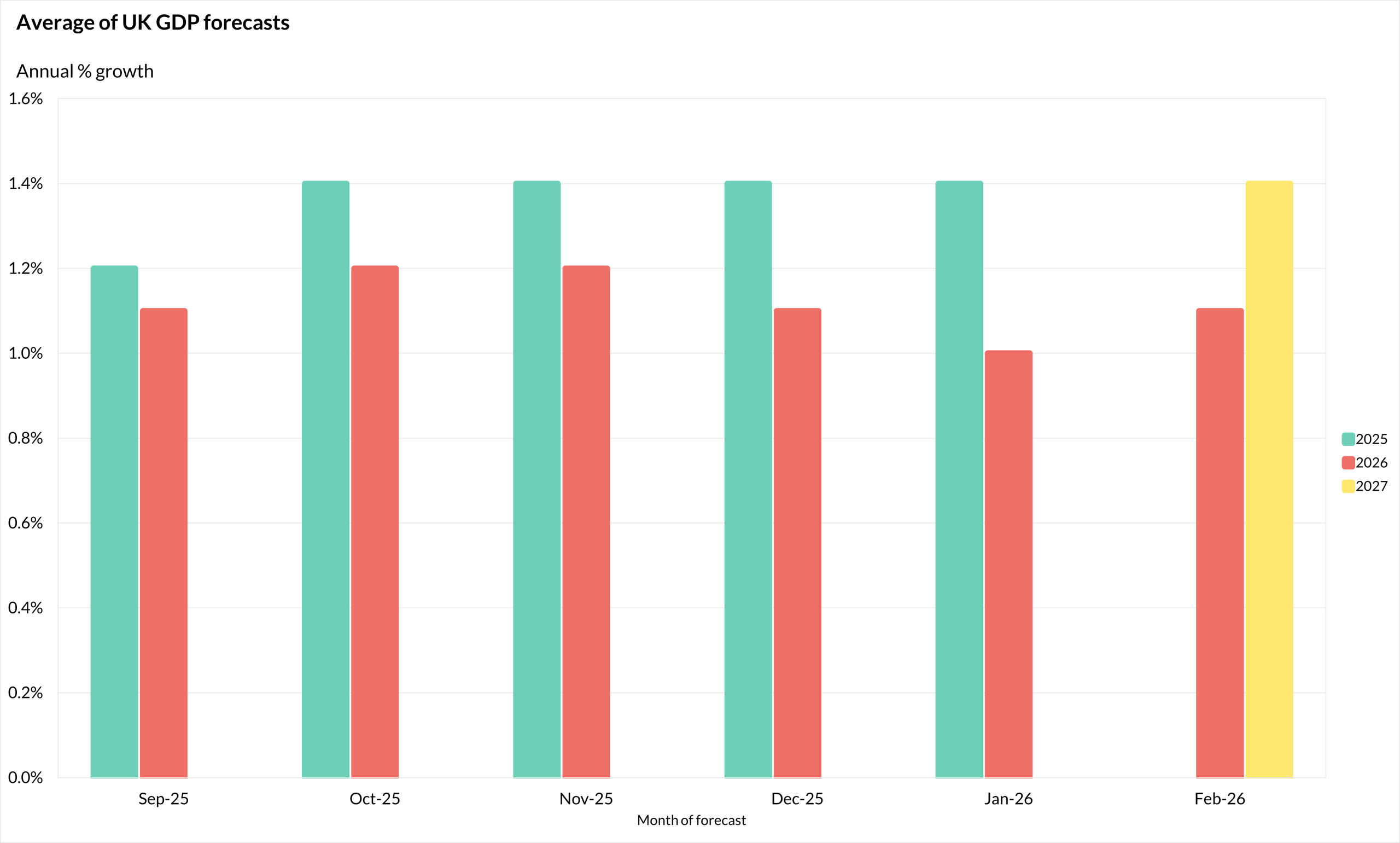 The average of new independent forecasts points to UK GDP growth of 1.1% in 2026, moderating to 1.4% in 2027. By comparison, GDP growth averaged closer to 2% through much of the 2010s. Since the pandemic, growth has settled nearer to 1% per year, reflecting the UK’s weaker post-COVID recovery.
